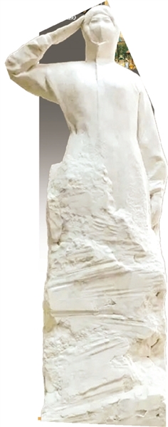中国美术馆馆长、著名雕塑家吴为山最新为抗击新冠疫情而创作了雕塑作品《使命》,也是一件大理石单人塑像。身着洁白的防护服,一位年轻的女军医高举右手庄严敬礼,虽然口罩遮挡了她的面容,人们却能感受到她坚毅的目光。这幅作品也非常优秀,同样的题材,可以与《日日夜夜》进行对比欣赏。