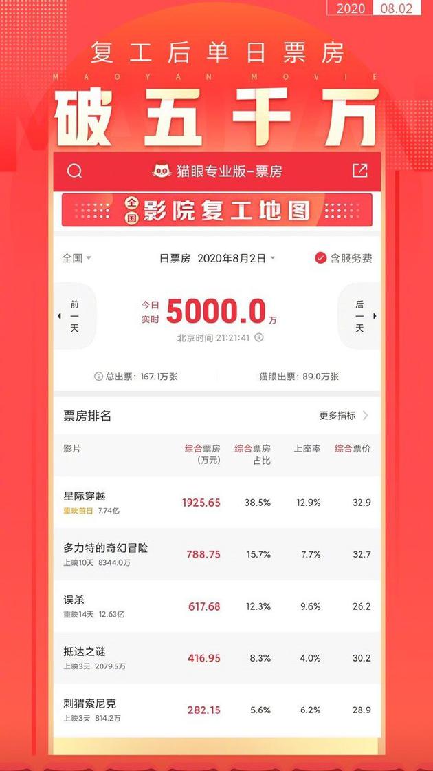 据猫眼数据,自7月20日电影院有序复工以来,全国单日票房在8月2日首次突破5000万元。其中,诺兰的《星际穿越》在复映首日斩获超1900万票房,成为单日票房冠军。