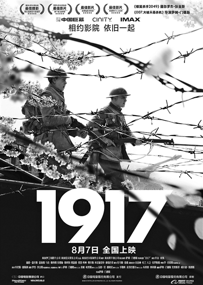 《1917》由中国电影集团公司进口,中国电影股份有限公司发行、译制,由阿里影业协助推广,讲述了两名年轻士兵冒死传递口信,拯救1600名战友的故事。