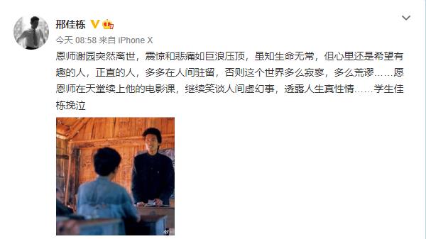 左小青和邢佳栋都是是谢园的学生,左小青说:“谢老师学识渊博,为人和善,在剧组给大家带来很多的快乐。”邢佳栋说:“愿恩师在天堂续上他的电影课,继续笑谈人间虚幻事,透露人生真性情。”