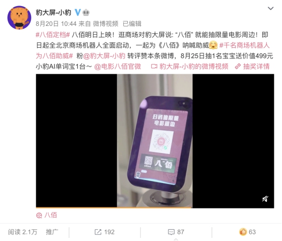 从8月19日-25日,从点映到上线期间,在北京各大商场,200多个猎豹移动网红营销机器人豹小秘DP,同时应援为《八佰》打call。消费者只要对它说出“八佰”,即可扫码,赢取钥匙扣、运动手环等《八佰》电影周边。