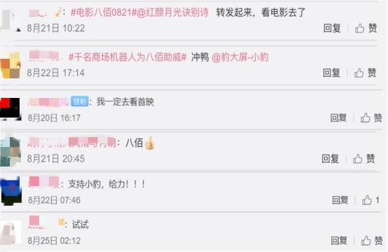 而在线上,相关微博引发网友热议,总阅读量破3万,“不错的电影,很期待”,“走起”、“试试”、“下班我就去影院看八佰”等。还有网友称赞电影好看的同时,也透露他是“陪女朋友逛街时,听到商场机器人‘吆喝’的《八佰》才临时走进电影院的,没想到电影如此精彩,更没想到电影会采用机器人的方式进行营销”。