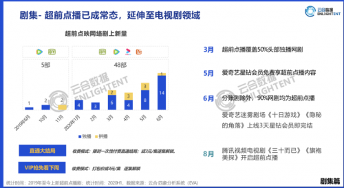 据云合2020H1会员内容报告(后台回复“2020会员”获取),现如今爱腾优芒四家视频平台内容已全面会员化,剧集方面尤为突出。根据统计,上半年127部网剧会员可以抢先收看内容。除分账据外,越来越多网剧实行超前点播。各家视频平台在超前点播服务上也出现了服务模式的分化,以腾讯视频为代表的VIP抢先看下周模式,和以爱奇艺为代表的直通大结局模式,成为这个模式发展的两条路径。