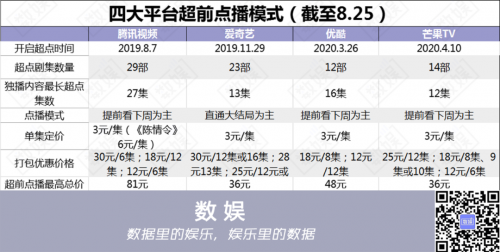 总体来看,经过一年时间摸索,四个平台的超前点播剧集单集价格普遍在3元左右,但在开通超点的剧集数量、应用集数、总价和优惠力度上则各有差异。