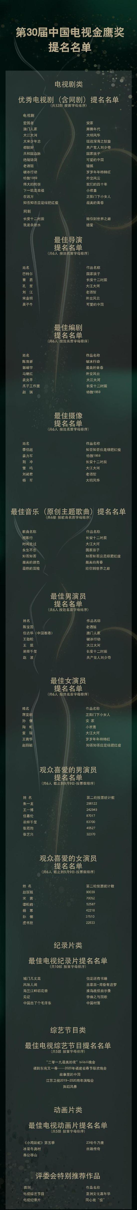 9月15日,第30届中国电视金鹰奖提名名单揭晓,《大江大河》《都挺好》《猎狐》《破冰行动》《外交风云》《知否》《长安十二时辰》《陪你到世界之巅》《结爱》等电视剧(含网剧)入围。