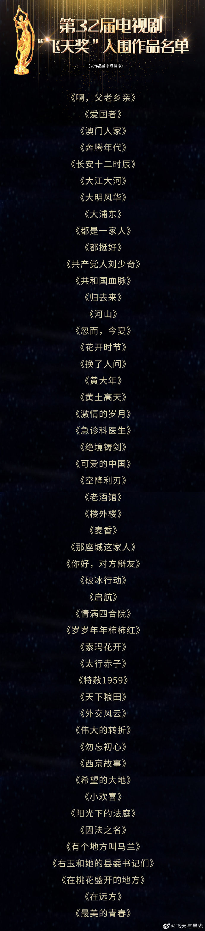 23日,中国电视艺术委员会官方微博“飞天与星光”公布第32届电视剧“飞天奖”入围作品名单,其中包括《大江大河》《长安十二时辰》《破冰行动》等多部作品。