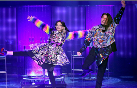 詹妮弗·劳伦斯(Jennifer Lawrence)录《吉米法伦深夜秀》(The Tonight Show Starring Jimmy Fallon)。她身穿紧身黑衣挤双球性感亮相,穿彩色鸡毛装与主持人演喜剧。