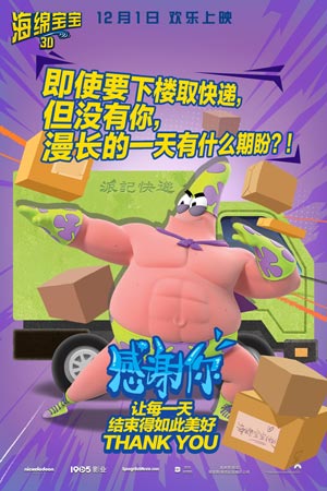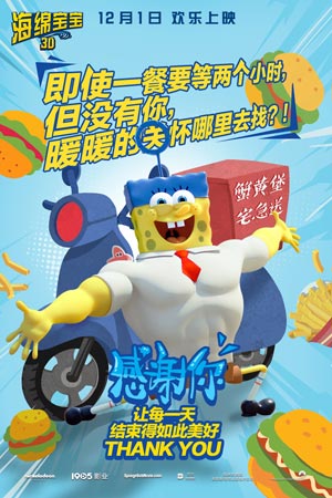 作为美国的传统节日,感恩节是合家团聚的日子,而漂洋过海的海绵宝宝一行人来到中国,发现除了家人和朋友,原来还有好多人都曾经帮助过自己,最爱星期一、时刻充满正能量的海绵宝宝希望能够带动大家珍惜身边的人,一起在感恩节这天说出“谢谢”。海报里的动画角色们告别了海底世界的手绘动画形象,改以出水后的3D形象示人。每个角色都扮演起平日里我们会遇到的人。