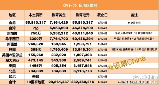 网易娱乐1月28日报道 由叶伟信执导、甄子丹、熊黛林、张晋、泰森、谭耀文等主演的功夫巨作《叶问3》自12月24日以来,先后在香港、台湾、大马、新加坡、澳洲、北美、英国等地接连上映,截止1月24日总票房超过3000万美元(2.33亿港币)。距香港首映过去整整一个月时间,《叶问3》可以取得这样的票房可谓是满载而归,片方大概早就是乐开花,愉快迎新年。