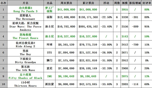 搜狐娱乐讯(文/耷子)在经历了暴风雪肆虐的前一个周末之后,上周末终于让北美电影市场恢复了些许元气。由梦工厂推出的超级动画大片《功夫熊猫3》,在全球范围内同步引爆。影片在北美收获如潮好评,影评人给出的好评率高达80%,本土周末票房突破4100万美元,毫无悬念地登上了北美周末票房冠军宝座。尽管此片的首映周末票房并不及《功夫熊猫2》的4770万美元,但客观原因也是有目共睹——北美今年冬季的气候不佳,多少影响了电影市场的正常发挥。《功夫熊猫3》的制作成本高达1.4亿美元,不过按照目前口碑炸裂的程度,影片在全球范围内大赚一笔并无悬念。“小李子”上周末凭《荒野猎人》赢得美国演员工会奖最佳男主角奖,离奥斯卡只有一步之遥。此片气势如虹,在新片扎堆的情况下依旧保持坚挺吸钞态势,上周末以1240万美元位居亚军,本土总收入突破1.38亿美元。克里斯-派恩主演的动作片《怒海救援》,表现中规中矩,首周末收获1032万美元,排名第四。
