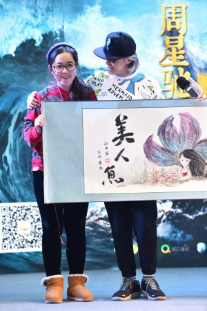 大年初五,星爷曾携《美人鱼》剧组回到老家宁波与当地影迷见面。活动当天见到一位特殊的影迷。她叫宋婧妍,是星爷的粉丝,但和别的粉丝不同,因为她听不到,同时也无法用语言表达自己的情绪。而她觉得星爷电影中所刻画的每一个小人物都是很励志的、向上的、具有正能量的。这些影片中的角色给她对生活带来很多信心。东莞活动当天她也特地来到现场为星爷送上了她亲手创作的《美人鱼》画卷和折扇。现场的观众也受到这位粉丝的深深感动,感觉到她身上的热情、乐观、善良。