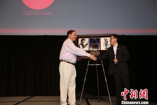 图为万达文化集团副总裁高群耀(右)与AMC CEO亚当·阿伦(左)