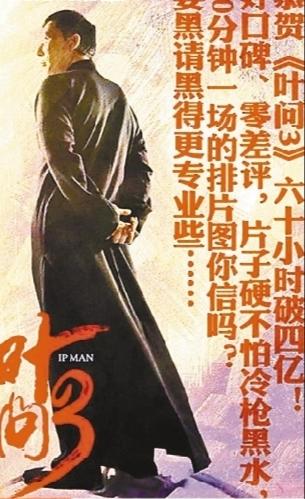 据悉,《叶问3》票房收益权同时由多家机构参与认购,其中直接参与者包括两家上市公司,以及第三方投资平台。认购的投资方与票房收益权的出让者均与《叶问3》的投拍方有着直接或者间接的关联。也就是说,投资方在这些金融机构的助推之下,希望通过该片的高票房推高股价,进而谋求更大的利益。在如此令人垂涎的金钱的诱惑下,票房“异动”也就顺理成章了——该片上映之前就有消息透露,《叶问3》的保底票房为10亿元。
