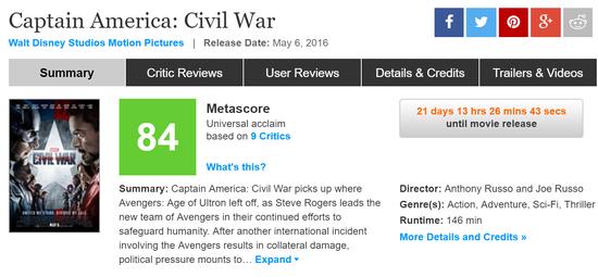 《美国队长3》在Metacritic取得84分的评分