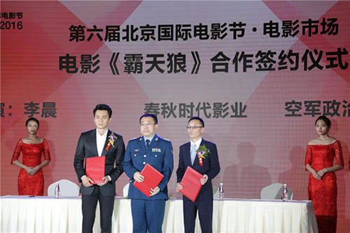 从左至右为《霸天狼》导演李晨,空政宣传局副局长陈浩,春秋时代影业董事长吕建民