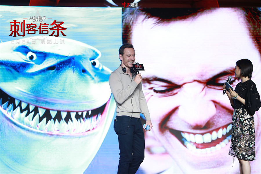 中工娱乐2017年2月22日报道 好莱坞动作冒险奇幻巨制《刺客信条》上映在即,法鲨也特意来到中国为影片摇旗呐喊。前日举行的发布会异常精彩,法鲨的亲和与幽默感染了所有粉丝,更在网上掀起了粉丝们的层层讨论,他的每一个小举动都成为影迷津津乐道、甚至调侃开玩笑的点,让法鲨再度成为“网红”。影片双料冠军的超高点映成绩与炸裂观众口碑,也助力影片周五的震撼上映,引发了更多人的期待。该片由贾斯汀·库泽尔执导,迈克尔·法斯宾德(《X战警:天启》)、玛丽昂·歌迪亚(《蝙蝠侠:黑暗骑士崛起》)、杰瑞米·艾恩斯(《蝙蝠侠大战超人:正义黎明》)、亚里安妮·拉贝德(《爱在午夜降临前》)和迈克尔·威廉姆斯(《无敌浩克》)等人主演,将于2月24日以3D、IMAX 3D、中国巨幕3D形式登陆全国院线。
