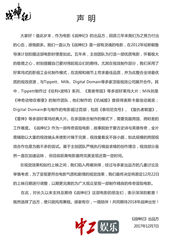 中工娱乐2017年12月7日报道 由让·雅克·阿诺监制,哈斯朝鲁执导,卓格赫编剧,陈伟霆、林允、胡军、赵立新、倪大红、李光洁、张歆艺、巴森扎布等主演的传奇冒险电影《战神纪》宣布改档,并发布改档声明。据悉,由于电影整体视效数量庞大,在多国联合制作的模式下,跨国、跨时差工作带来沟通成本和工作难度的增加,导致电影无法于原定的档期上映,故选择改档。在发布改档声明的同时,电影《战神纪》发布了一支视频特辑,《战神纪》全球视效总监及CG指导亲自出镜,针对电影的视效工作展开说明。