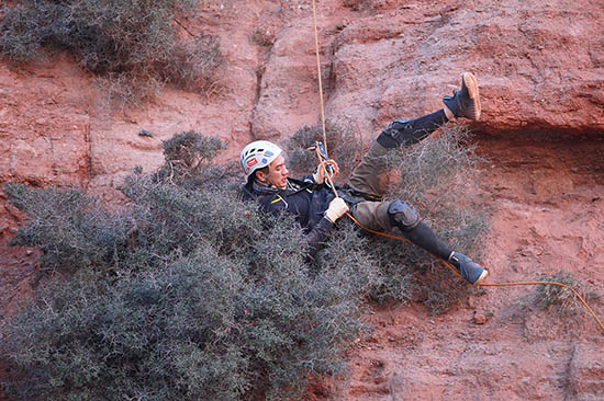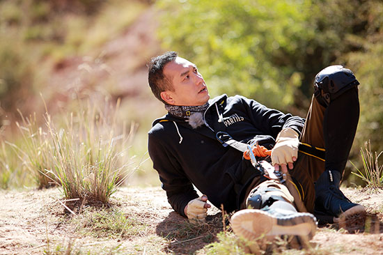 近日,剧组曝光了一组黄觉的录制花絮图,画面中黄觉全副武装,头盔、运动服、护膝、攀岩索一应俱全,身姿矫健,专心致志地进行着崖降动作,其身后峭壁、岩石等物则让人感受到任务的艰巨和环境的凶险。黄觉在事后回忆时表示,首次挑战这种高难度的真人秀活动十分刺激,“录制是在张掖的大峡谷,正赶上下雨,气温很低,我们前一天练习了10米崖降,第二天就直接体会百米崖降,当时也没觉得胆小,不过中途被树挂住了,没有人来救援,还有些小紧张,但定下神来之后一步一步往下走,也就没有感觉到有多大困难。”