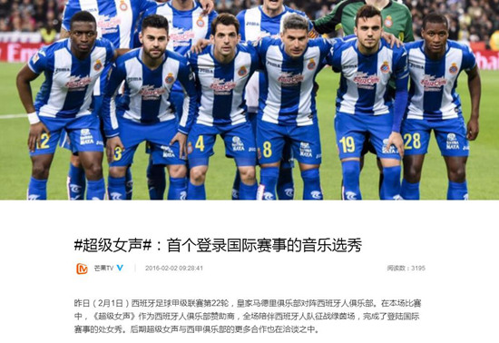昨日(2月1日)西班牙足球甲级联赛第22轮,皇家马德里俱乐部对阵西班牙人俱乐部。在本场比赛中,《超级女声》作为西班牙人俱乐部赞助商,全场陪伴西班牙人队征战绿茵场,完成了登陆国际赛事的处女秀。后期超级女声与西甲俱乐部的更多合作也在洽谈之中。