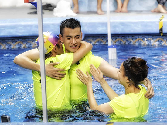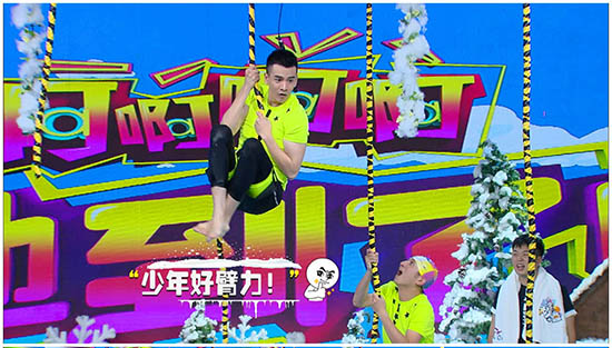 在这一轮游戏环节中,因怕抓到“断绳”而落水的众人神态各异,吴昕更是蹲在池边手脚发软,十分搞笑。而经超不仅一跃而起用力抓住绳索,还如“窜天猴”般奋力爬上顶部,惹得何炅谢娜大赞其“少年好臂力”。而最终不幸落水的他也毫不介意素颜湿身,湿衣包裹下更显出经超身材比例十分完美。