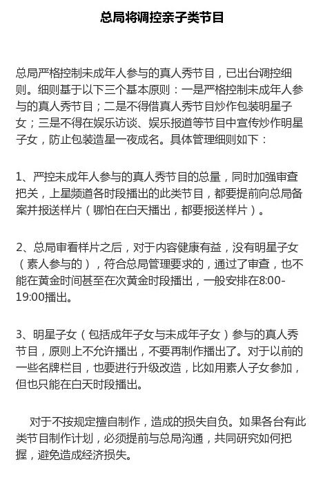 3、明星子女(包括成年子女与未成年子女)参与的真人秀节目,原则上不允许播出,不要再制作播出了。对于以前的一些名牌栏目,也要进行升级改造,比如用素人子女参加,但也只能在白天时段播出。