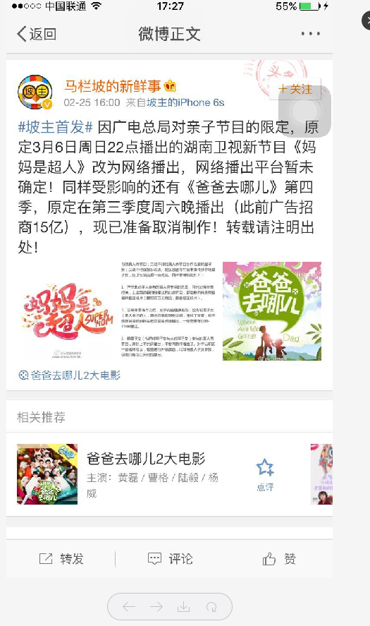 今日(2月25日)有网友@马栏坡的新鲜事爆料称,因受“限娃令”的影响,原定3月6日周日22点播出的湖南卫视新节目《妈妈是超人》将改为网络播出,目前播出平台尚未确定。作为湖南台第三季度的大项目《爸爸去哪儿》也受到了影响,原定于第三季度周六晚播出的《爸爸去哪儿》第四季据爆料称已经取消制作。