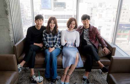 韩国时间16日下午2时,《太阳的后裔》剧组在江南区某演播厅里举办了记者见面会,主演宋仲基、宋慧乔、晋久、金智媛接受了媒体采访。