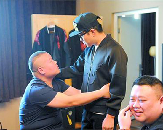 在彩排现场见到岳云鹏多少有些意外。先前导演组几乎已经确认,因为没有档期,岳云鹏将缺席彩排。不过岳云鹏的状态并不好,后来接受采访时他感慨:以前看电视上大明星说他们只能在飞机上睡觉,我不相信啊,怎么可能连睡觉的时间都没有呢?彩排时,岳云鹏的脸上始终蒙着阴云,标志性笑容成了纯粹的表演内容。《欢乐喜剧人》总决赛,德云社几乎全体出动。彩排开始前,徒弟们特地给“师娘”于谦摆了把靠背椅在台前。将近四个小时的彩排,于谦一个动作、一句台词地给弟子们抠细节,这把靠背椅也终究成了“摆设”。 这个节目他们排了三天,总决赛前夜决定彻底推翻,当天凌晨赶出了新本子。岳云鹏说他说了十几年相声,从来没像这次这么紧张,因为这不是他一个人的战斗。没成想让岳云鹏露出笑容的是“敌人”大鹏。合作过电影又一起上过春晚,在好朋友跟前,“贱”兮兮的小岳岳突然变得乖巧起来,大鹏一会儿揉揉他头,一会儿捏捏他脸,他也不反抗。