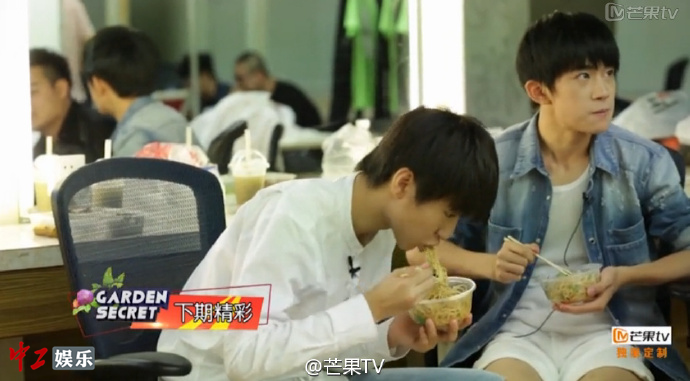 由于三小只一路奔波,到了录制现场早已饿意十足,节目组非常贴心的为他们准备了长沙凉面。三小只立马狼吞虎咽起来,秒变小吃货,尽显呆萌的吃相,对长沙的凉面也是赞不绝口。而这一切都没有躲过黑衣人小方的眼睛,在一旁偷偷的记录下了三小只的吃相!