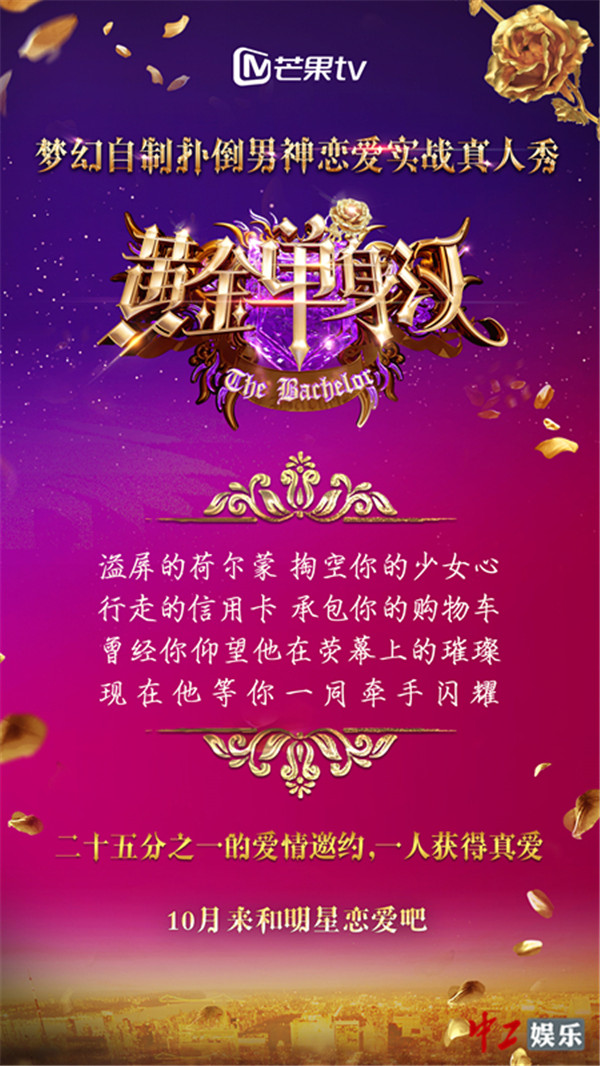 中工娱乐8月15日报道 芒果TV梦幻自制扑倒男神恋爱实战真人秀节目《黄金单身汉》将于8月16日启动女嘉宾招募,15日推出第一版概念海报。该节目引进美国ABC热播电视相亲真人秀《The bachelor》,进行本土化改造升级,由一位“白马王子型”单身男明星与25位素人女嘉宾开启追爱之旅。