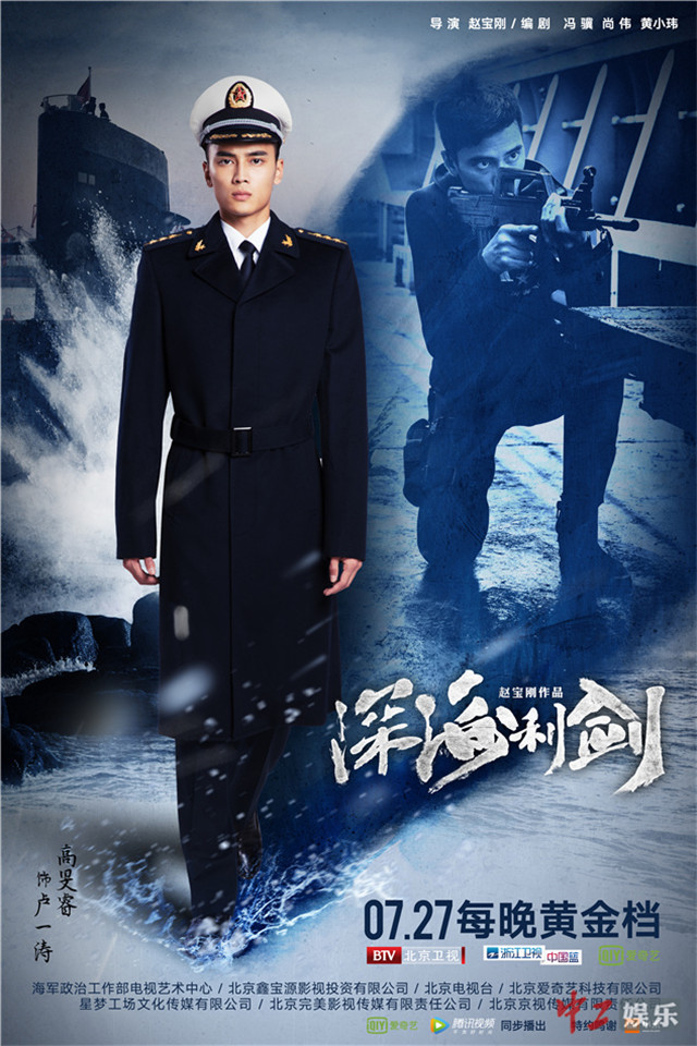 《深海利剑》是一部诠释新一代中国海军潜艇兵成长历程的电视剧,镜头对准一群即将面对人生选择的90后大学生,将他们在进入部队后从迷茫犹豫到坚定不移的蜕变过程精彩地呈现出来,跌宕起伏的紧张剧情和深刻感人的情感故事共同塑造出了生动、鲜活、励志、强大的优秀潜艇兵形象。在最近曝光的“踏浪前行”单人海报中,可以看出赵宝刚导演一贯的艺术风格,主角脚下伴随着朵朵浪花,眼望前方,背后是海浪与潜艇的震撼碰撞,画面极具爆发力,充分展现了质感出众、画面有力的赵氏美学。卢一涛(高旻睿饰)、金子晴(刘璐饰)、尚堂(王阳饰)、姜耀(徐洋饰)、韩冰洋(金禹伯饰)、张琳(周放饰)等几位主演统一身着庄严肃穆的深蓝色军装,坚定的眼神和不容置疑的气魄不怒自威。与主视觉形象相对的,是一旁人物日常的生动画面,有人在热血战斗,有人在静默潜伏,有人在热切期盼,无论哪一种,都让人心生敬仰,热泪盈眶。海底最强战队一触即发,接下来,且看这支高智商、高素质、高标准的队伍力挽狂澜,浴血新生。