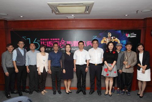 第十六届华语音乐传媒大奖新闻通气会_陆建中、周本波、孙丽丽、崔向红、尹冀鲲、李涛、符常耿、黄国庆、林宏钢等合影留念 孙振飞摄