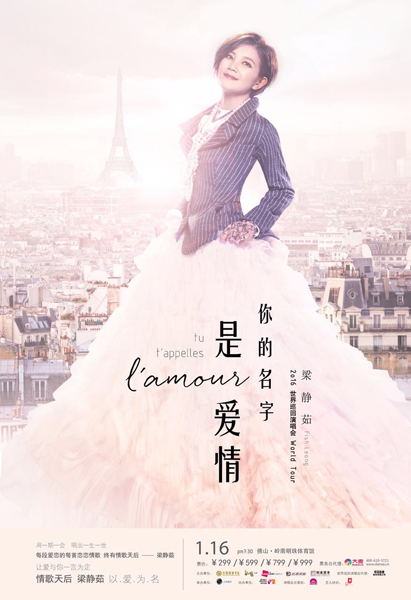 梁静茹“你的名字是爱情”全国巡演佛山站26日正式开票,佛山站演唱会将于1月16日在佛山岭南明珠体育馆盛大开演。本次佛山巡回演唱会是2016年梁静茹首场演唱会,主办方IME娱乐集团、乐福文化为了打造新年首场梁静茹演唱会,不仅聘用顶级乐团阵容,舞台更是空前奢华,全力打响2016开年第一炮,新年新气象给歌迷更好的视觉、听觉双重享受。