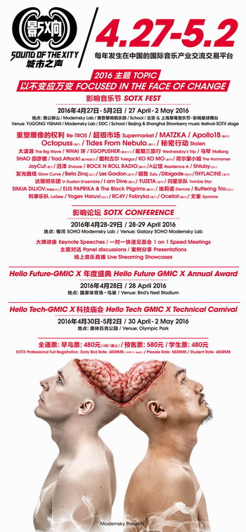 摩登天空旗下 “影响城市之声” 将联合长城会旗下“全球移动互联网大会-GMIC”,共同打造“4月28日于国家体育场鸟巢举办的Hello Future-GMIC X 年度盛典”、“4月30日-5月2日于奥林匹克公园举办的Hello Tech-GMIC X科技庙会”。