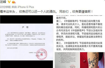 汪峰工作室及汪峰本人先后在微博发文,声明网上传播不雅图片与视频与汪峰本人无关。工作室已交由律师处理。