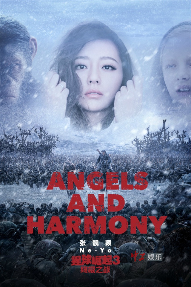中工娱乐2017年9月4日报道 9月4日上午, 20世纪福斯电影官方微博宣布由张靓颖和美国著名唱作人Ne-yo一起为电影《猩球崛起3:终极之战》演唱中国区推广曲《Angels and Harmony》。随后张靓颖转发微博并透露这首歌将于近期上线。这也是张靓颖继《终结者5》、《007:幽灵党》、《长城》之后再次以全英文曲目助阵国际大片。