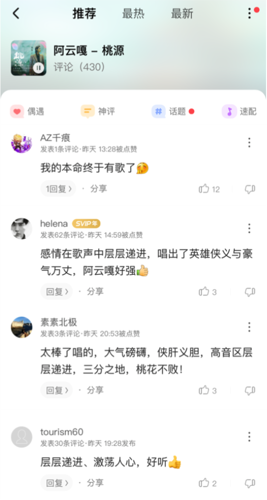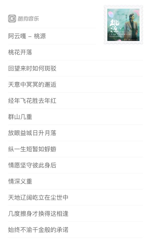 阿云嘎的实力演绎,为《桃源》带上浓浓音乐剧色彩。歌曲分不同段落层层铺进,从一开始的低吟浅唱带入情境;到中段情绪逐渐激昂,画面意境豁然开朗;最后副歌又转入深沉,将人物的心境完全承载于音乐之中。荡气回肠的曲目深深打动一众歌迷,纷纷涌入酷狗歌曲评论区分享听歌感悟:“我的本命终于有歌了”、“感情在歌声中层层递进,唱出了英雄侠义与豪气万丈,阿云嘎好强”、“激荡人心,好听”。