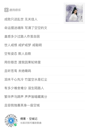 “成败只送乱世,无关佳人”略带哀伤的歌词,婉转清丽的嗓音,傅菁用她独特的声音讲述了一个关于等待的故事:为一个人守护一座城的孤独。在这首歌曲里,傅菁卸下角色里的孤傲和冷漠,在旋律里袒露出无法掩饰的真心,虽看透红尘却又被烟火缠绕,“泪未干心先冷,竹篮空水是红尘,繁华声马蹄声,声声皆暗藏离分,且让我独善其身一座空城”当爱不在身边,这座城是否还值得留恋?