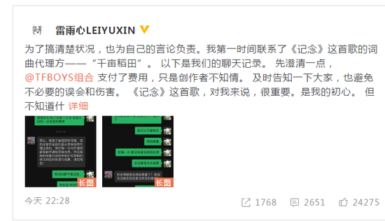 8月22日晚,TFBOYS组合在七周年演唱会上演唱了《记念》后,该歌创作者雷雨心发文称感到自己很被动,“希望之后可以得到询问,也算是对创作者的一种尊重”,引发版权争议。随后,雷雨心再次发文澄清,称联系词曲代理方后了解,“TFBOYS组合支付了费用,只是创作者不知情。”