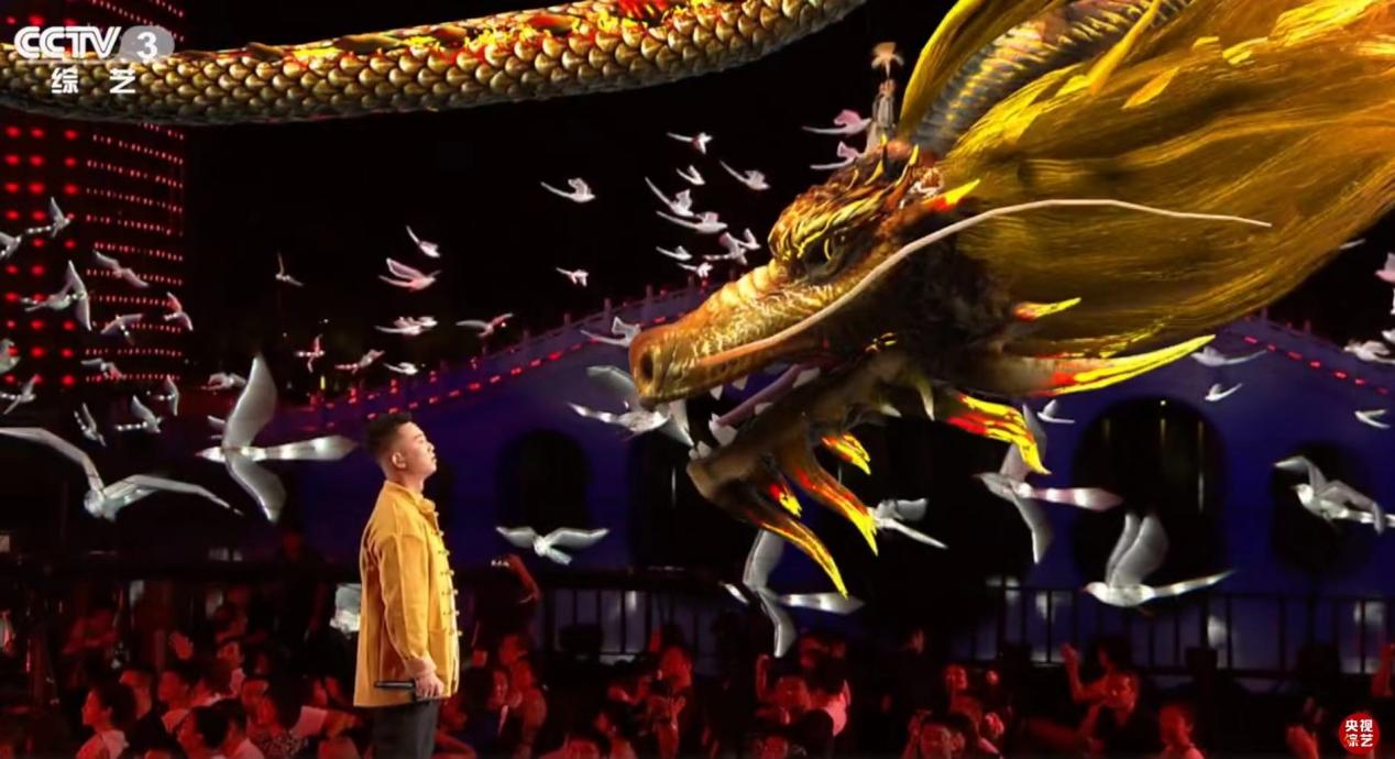一开场,GAI周延就用高潮迭起的副歌部分点燃了全场气氛。随着歌曲的循序渐进,GAI周延与龙同框对视的特效画面又给表演加上了点睛之笔,整首《华夏》的舞美大气磅礴,令人倍感震撼。作为一名说唱歌手,GAI周延通过这次的舞台,让更多人看到了他多年的沉淀积累和表达真实自我的音乐态度。