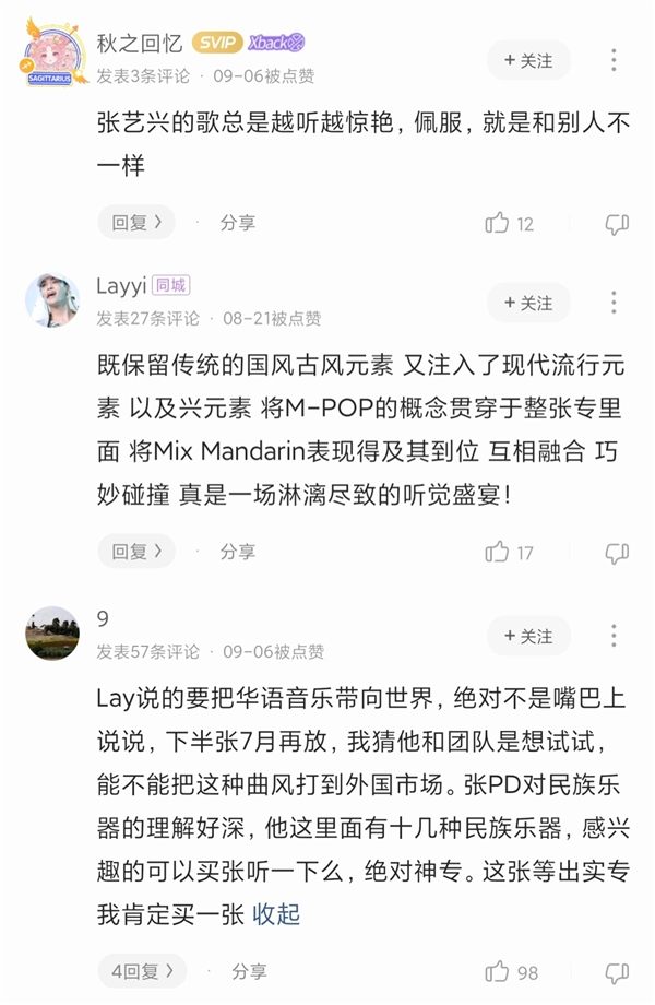《莲》收录的同名主打歌《莲》、《玉》等12支风格迥异的曲目,彰显了中西融合的M-POP的魅力,让酷狗网友们倍感惊艳。在同名主打歌《莲》评论区里,网友对张艺兴“既保留传统的国风古风元素,又注入了现代流行元素以及兴元素”的创作理念赞不绝口;在彰显拉丁风格的《蹦》里,网友留言“听的时候脑海里不禁浮现夏日海滩上的各种情景”,纷纷化作《莲》的“首席安利官”。