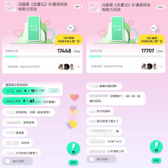 据悉,乐迷不仅可以与同好在线听歌交流,也可通过“扑通来电”助力偶像新歌曝光。在偶像新歌发布的七天内,用户只需在扑通房间中停留,或是邀请朋友一起来听新歌,就能获得“电力值”,而偶像本人空降,更将为房间贡献巨额电力;最终,偶像和粉丝共同积攒的电力值,将成为“心动电力认证”,从而解锁相应的推广资源,助推新歌快速“破圈”。