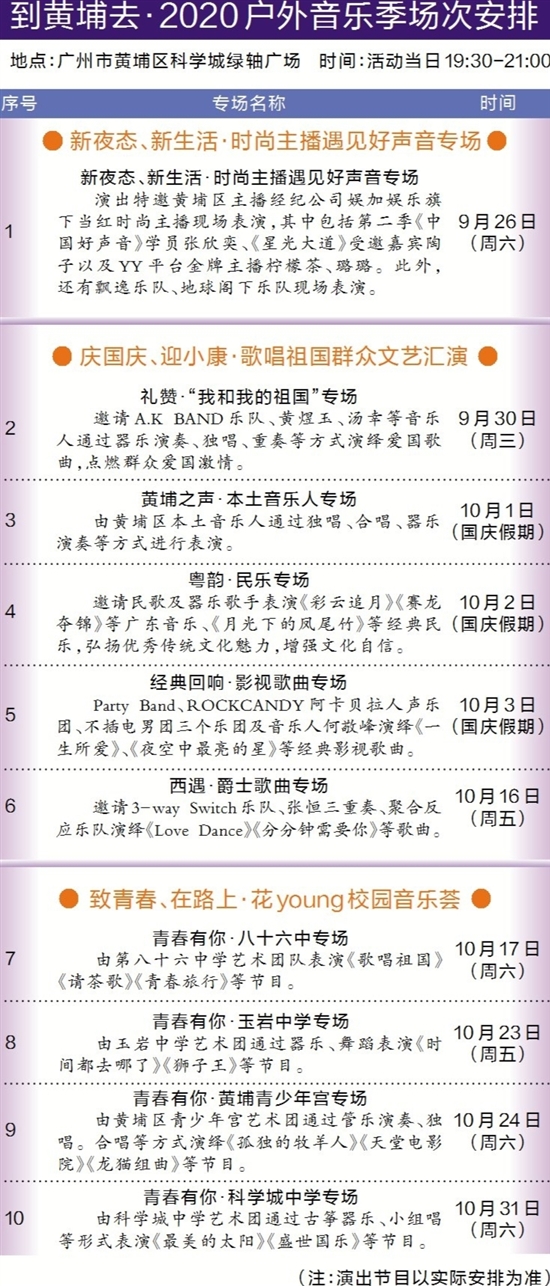 今年黄埔户外音乐季打造“时尚主播遇见好声音”“歌唱祖国群众文艺汇演”“花young校园音乐荟”三个板块,分为10个不同主题的音乐专场,涵盖流行乐、红歌、民乐、爵士乐、经典歌曲以及黄埔本土原创音乐等,最大限度满足不同人群的需求。