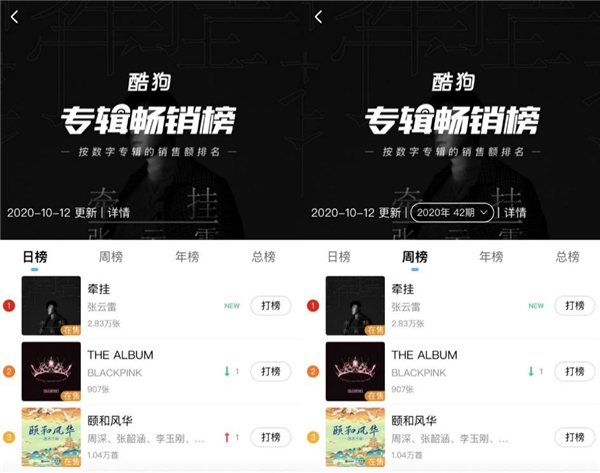 精雕细琢的EP《牵挂》不愧为倾心之作,一经上线便包揽10月12日酷狗专辑畅销榜日榜、周榜的TOP1之席,足以证明张云雷的音乐号召力!