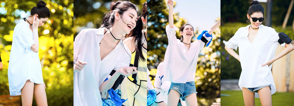 维密超模奚梦瑶身穿白衬衣,搭配牛仔下装,大秀美腿。阳光灿烂的笑容搭配凹凸有致的火辣身材,既显性感十足,又散发出女性独特的魅力,端庄又不失柔美,将“俏皮的性感”发挥到极致,迷倒众人。