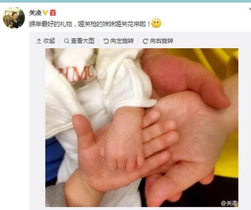 2月15日中午,关凌通过微博晒出了一家四口牵手的温馨照片,庆祝二胎女儿出生。她留言称:“猴年最好的礼物,姬关枪的妹妹姬关花来啦!”