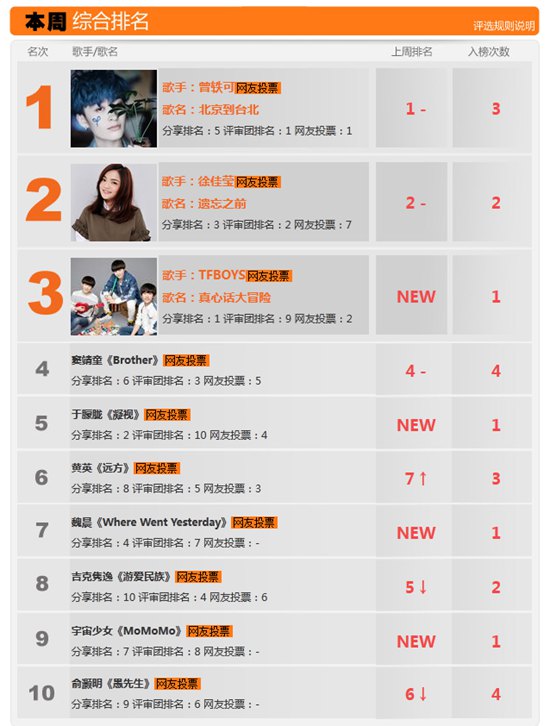 搜狐娱乐讯 (文/沉城)又是相隔两周未与乐迷朋友们见面,不知在这乍暖还寒的季节你们是否有照顾好自己的身体时刻添加衣物呢,有好音乐陪伴才是正经事,期待已久终于等到本周为你们揭晓新一期榜单了。在新歌低迷数周后,终于迎来了新歌全面开花的一期,第203期新声榜共计上榜四首新歌,其中取得最好名次的新歌来自于TFBOYS《真心话大冒险》,首周凭借分享排名第一、投票排名第二的好成绩空降季军,成功加入曾轶可、徐佳莹、窦靖童三位创作人已持续两周的混战。经过三周的再次较量,曾轶可《北京到台北》依然掌控着冠军的权杖,而徐佳莹《遗忘之前》一如其在我是歌手的表现,各方面表现都很舒服,却总差一点锋芒毕露的火候,第二周上榜依然排在亚军的位置。本周的季军TFBOYS《真心话大冒险》,如若不是在评审团排名的低迷,相信其很有可能空降至本周的冠军,这首歌曲以朋友间常玩的游戏“真心话大冒险”为引线收集了TFBOYS三人的喜好和对对方的看法,以诙谐幽默的吐槽方式呈现TFBOYS三个男孩间满满的兄弟情谊,旋律欢快轻松,是一首很适合在春天聆听的暖心之作,期待其在下一周的表现。