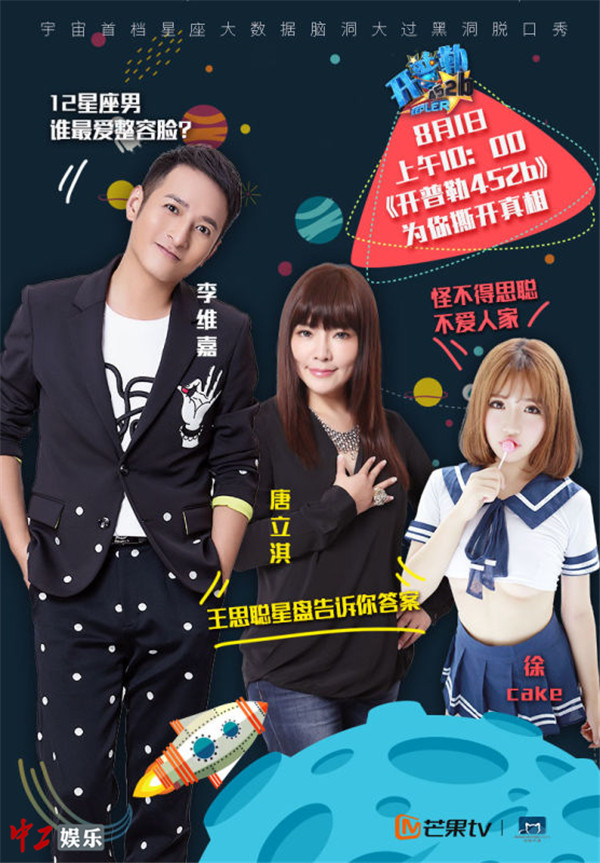 芒果TV即将于7月25日上线一档新节目——首档星座大数据脱口秀《开普勒452b》,节目由李维嘉和星座大师小猪主持,台湾星座占卜专家唐立淇担任节目嘉宾。
