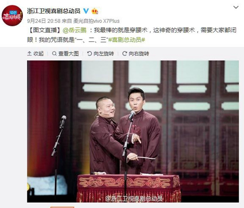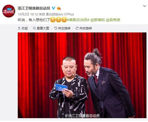 资料图:郭德纲、吴秀波合作主持。《喜剧总动员》微博截图