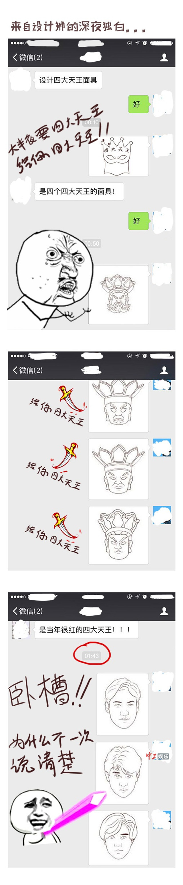 四大天王要来《蒙面唱将》的消息让网友兴奋不已,节目以烧脑著称,唱将们戴的面具也设计得创意十足,堪称谜之伪装。设计师第四版的面具设计基本符合节目画风,跑车面具抛出了郭富城酷爱跑车的梗,创意接近本季曝光的球鞋侠面具,为张学友设计的灰太狼面具,显然参考了他的经典作品《雪狼湖》,也令人联想到《蒙面》第一季孙楠戴过的羊驼。然而节目的面具更显华丽,这份画稿略显简陋,网友纷纷吐槽:“这是个假的设计师吧!”